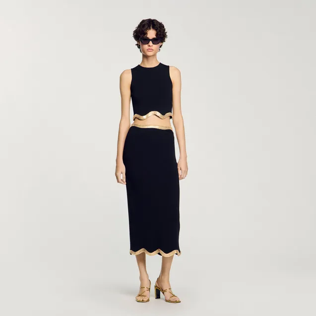 Áo len ngắn tay phối dây xích hình sóng ở gấu áo.